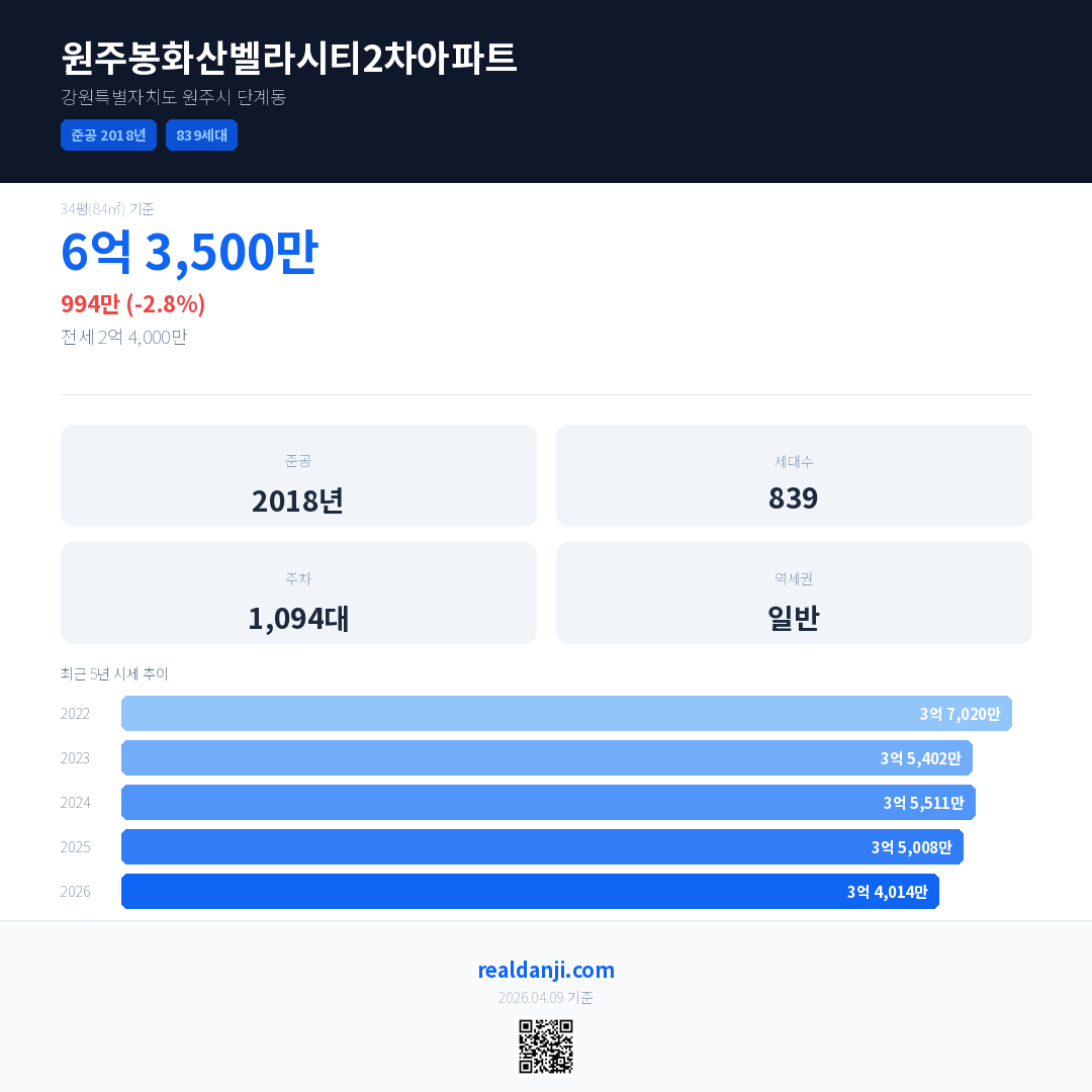 원주봉화산벨라시티2차아파트 최근 거래가는 6억 3,500만입니다. (2026-04)
