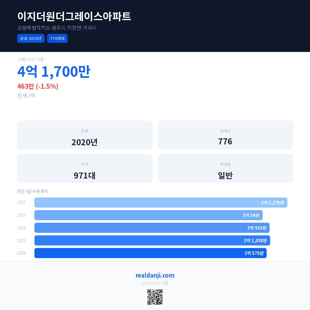 이지더원더그레이스아파트 국민평형 기준 2026년 평균 거래가는 3억 575만으로, 전년 대비 1.5% 하락 했습니다.