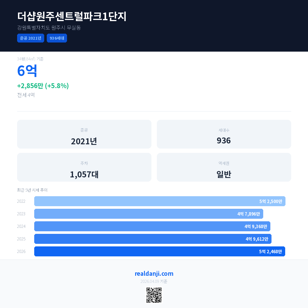 더샵원주센트럴파크1단지 국민평형 기준 2026년 평균 거래가는 5억 2,468만으로, 전년 대비 5.8% 상승 했습니다.