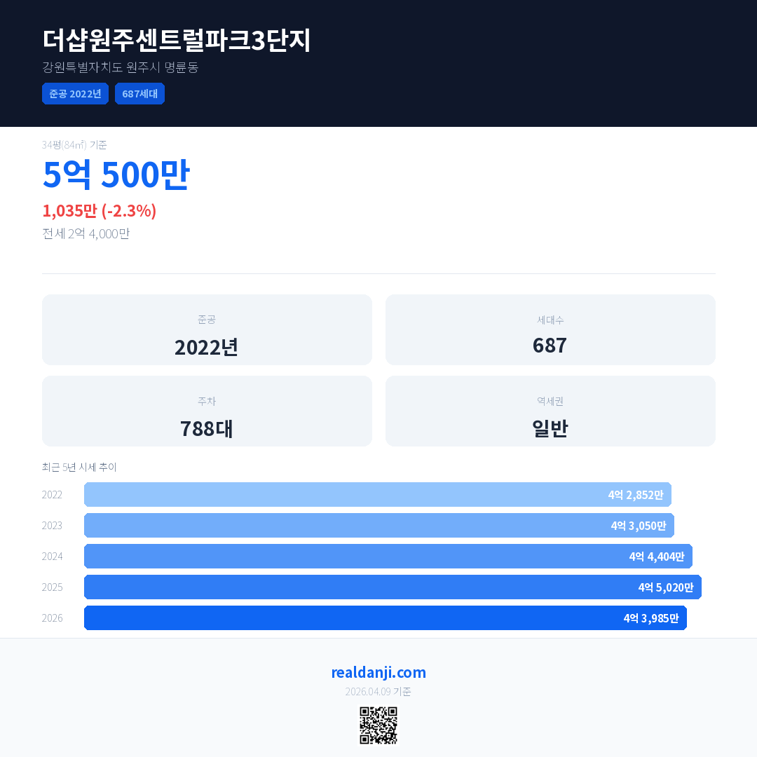 더샵원주센트럴파크3단지 국민평형 기준 2026년 평균 거래가는 4억 3,985만으로, 전년 대비 2.3% 하락 했습니다.