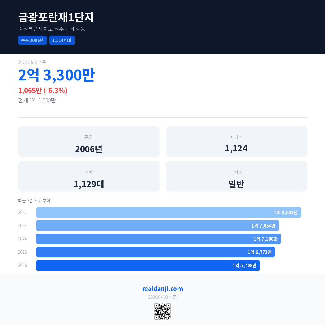 금광포란재1단지 국민평형 기준 2026년 평균 거래가는 1억 5,708만으로, 전년 대비 6.3% 하락 했습니다.