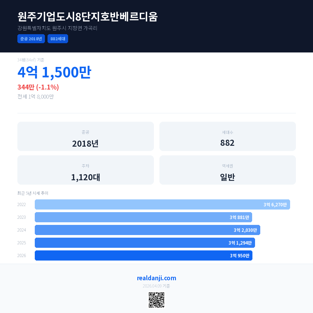원주기업도시8단지호반베르디움 최근 거래가는 4억 1,500만입니다. (2026-03)