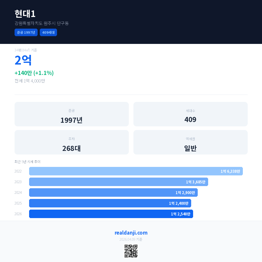 현대1 최근 거래가는 2억입니다. (2026-04)