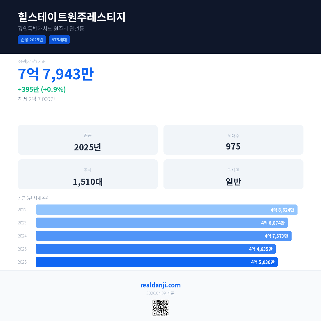 힐스테이트원주레스티지 최근 거래가는 4억 3,990만입니다. (2026-03)