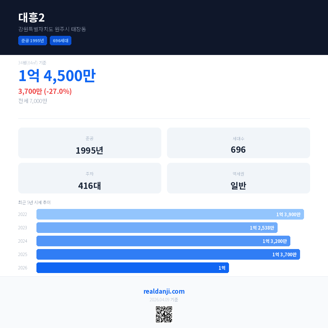 대흥2 국민평형 기준 2026년 평균 거래가는 1억으로, 전년 대비 27.0% 하락 했습니다.
