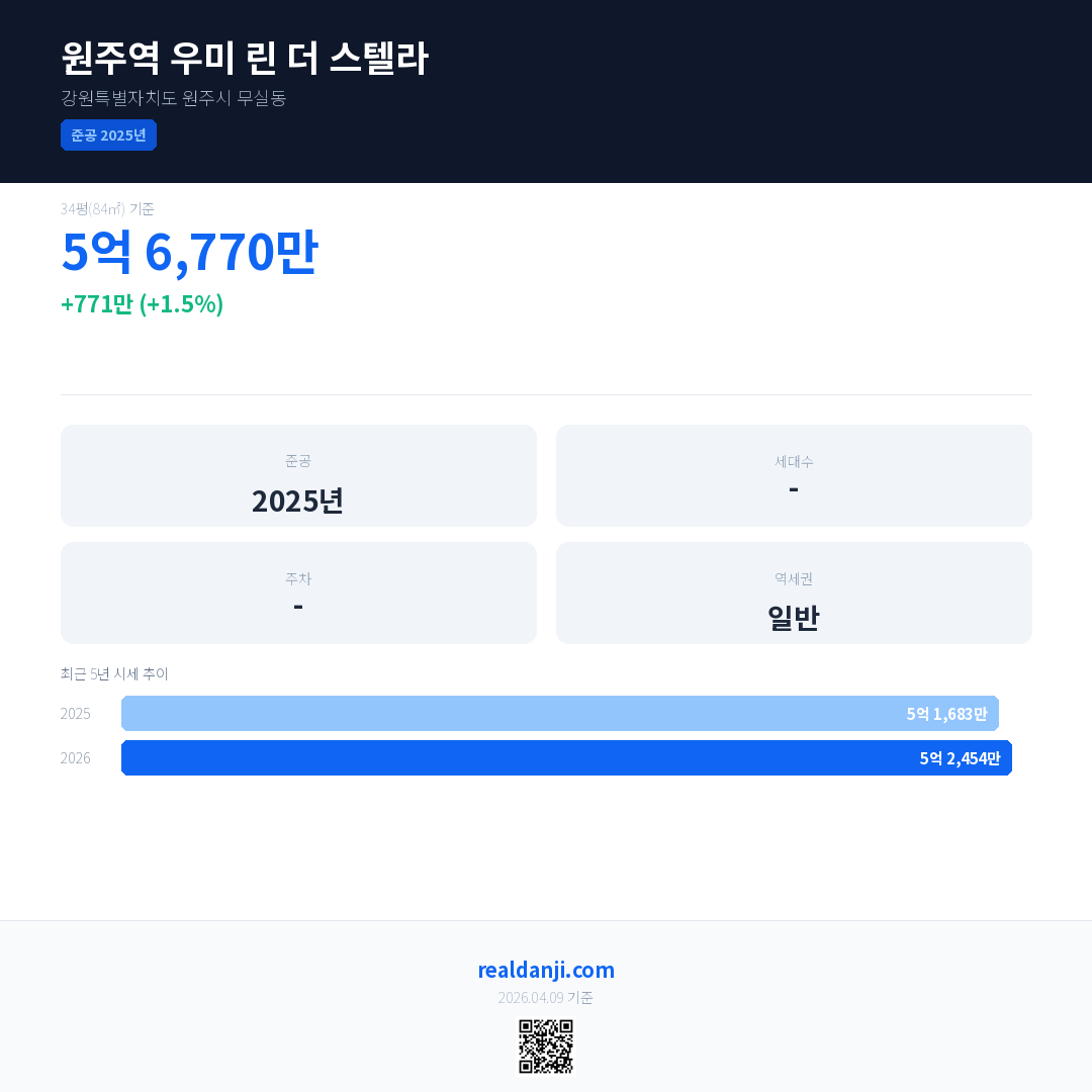 원주역 우미 린 더 스텔라 국민평형 기준 2026년 평균 거래가는 5억 2,454만으로, 전년 대비 1.5% 상승 했습니다.