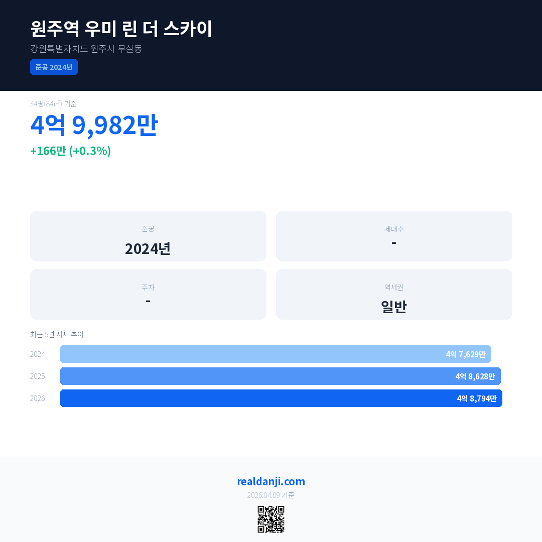 원주역 우미 린 더 스카이 국민평형 기준 2026년 평균 거래가는 4억 8,794만으로, 전년 대비 0.3% 상승 했습니다.