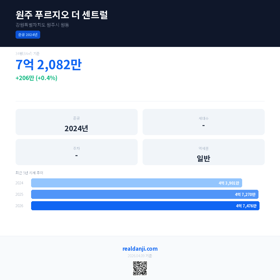 원주 푸르지오 더 센트럴 국민평형 기준 2026년 평균 거래가는 4억 7,476만으로, 전년 대비 0.4% 상승 했습니다.