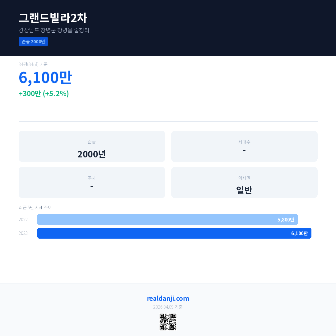 그랜드빌라2차 국민평형 기준 2023년 평균 거래가는 6,100만으로, 전년 대비 5.2% 상승 했습니다.