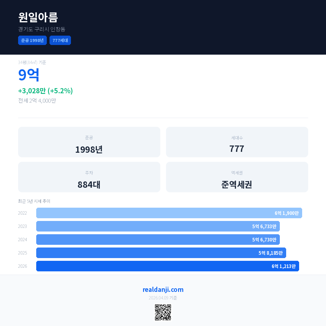 원일아름 최근 거래가는 9억입니다. (2026-04)