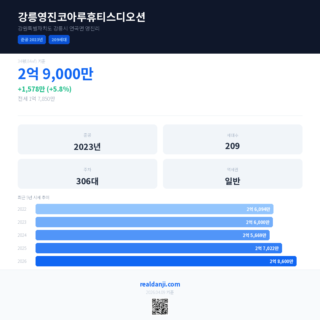 강릉영진코아루휴티스디오션 국민평형 기준 2026년 평균 거래가는 2억 8,600만으로, 전년 대비 5.8% 상승 했습니다.