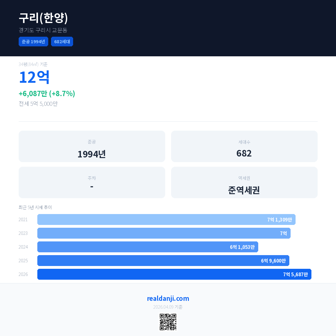 구리(한양) 최근 거래가는 12억입니다. (2026-03)