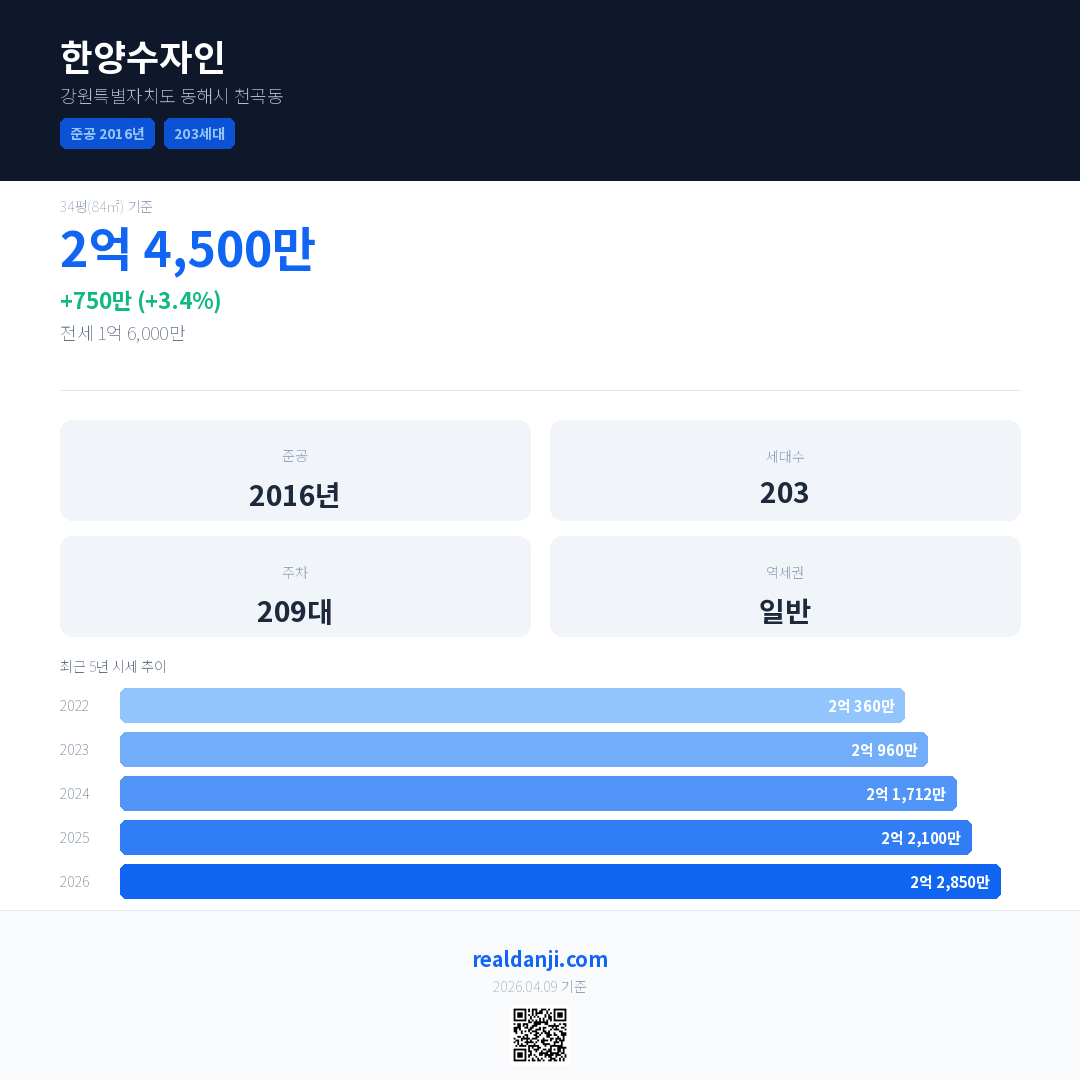한양수자인은(는) 2016년에 준공되었으며, 현재 10년차입니다. 총 203세대 규모입니다.
