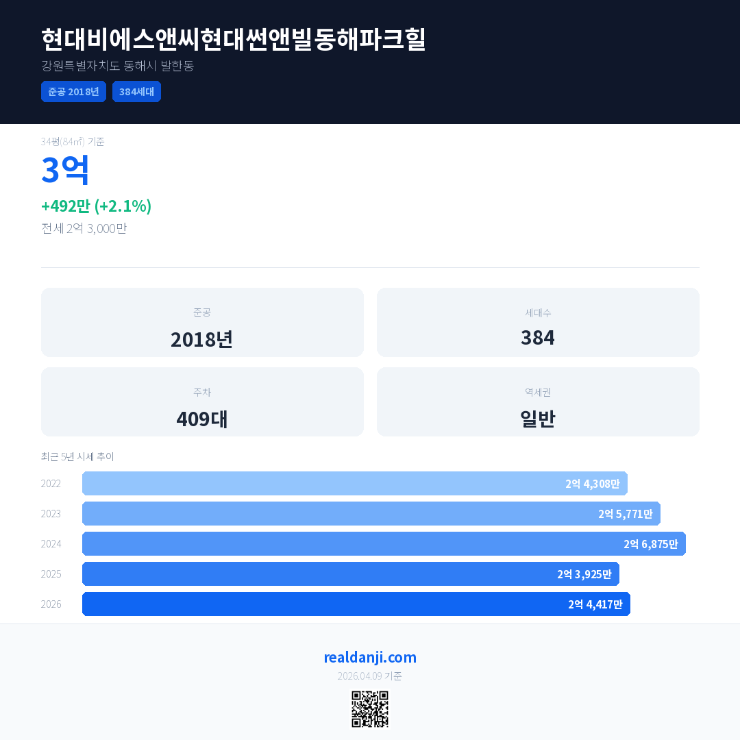 현대비에스앤씨현대썬앤빌동해파크힐 최근 거래가는 3억입니다. (2026-04)