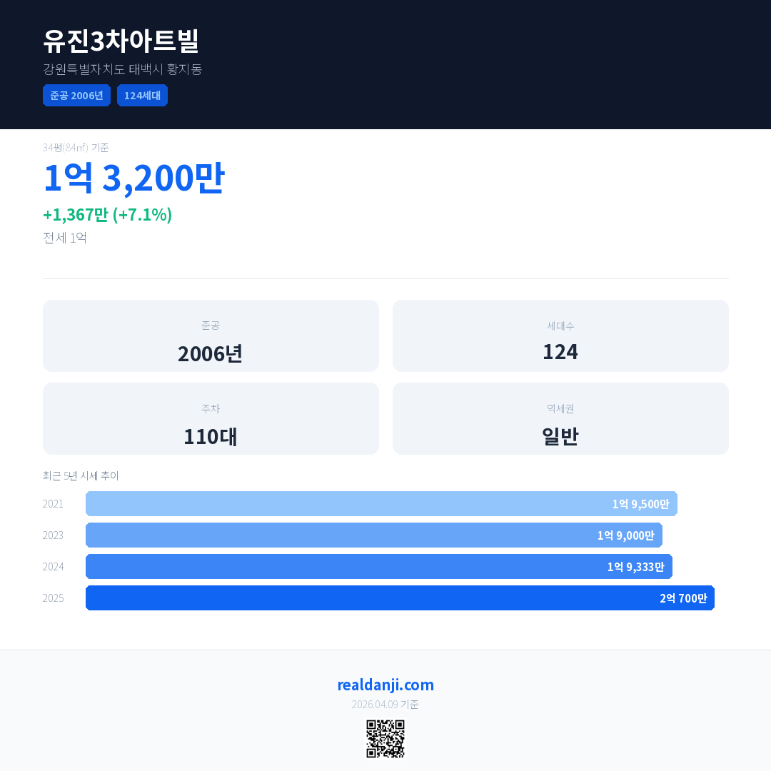 유진3차아트빌 국민평형 기준 2025년 평균 거래가는 2억 700만으로, 전년 대비 7.1% 상승 했습니다.