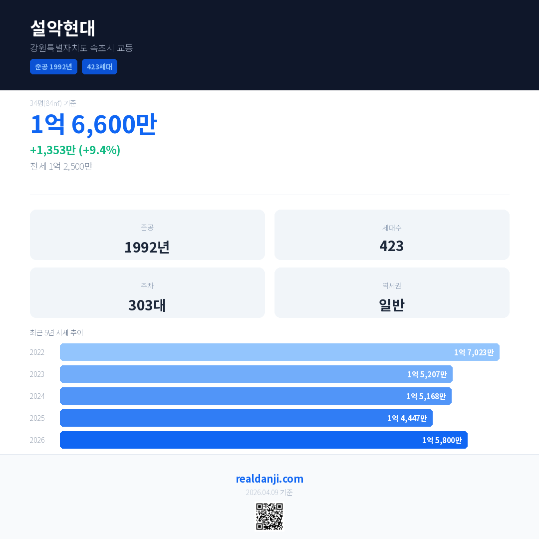 설악현대 국민평형 기준 2026년 평균 거래가는 1억 5,800만으로, 전년 대비 9.4% 상승 했습니다.