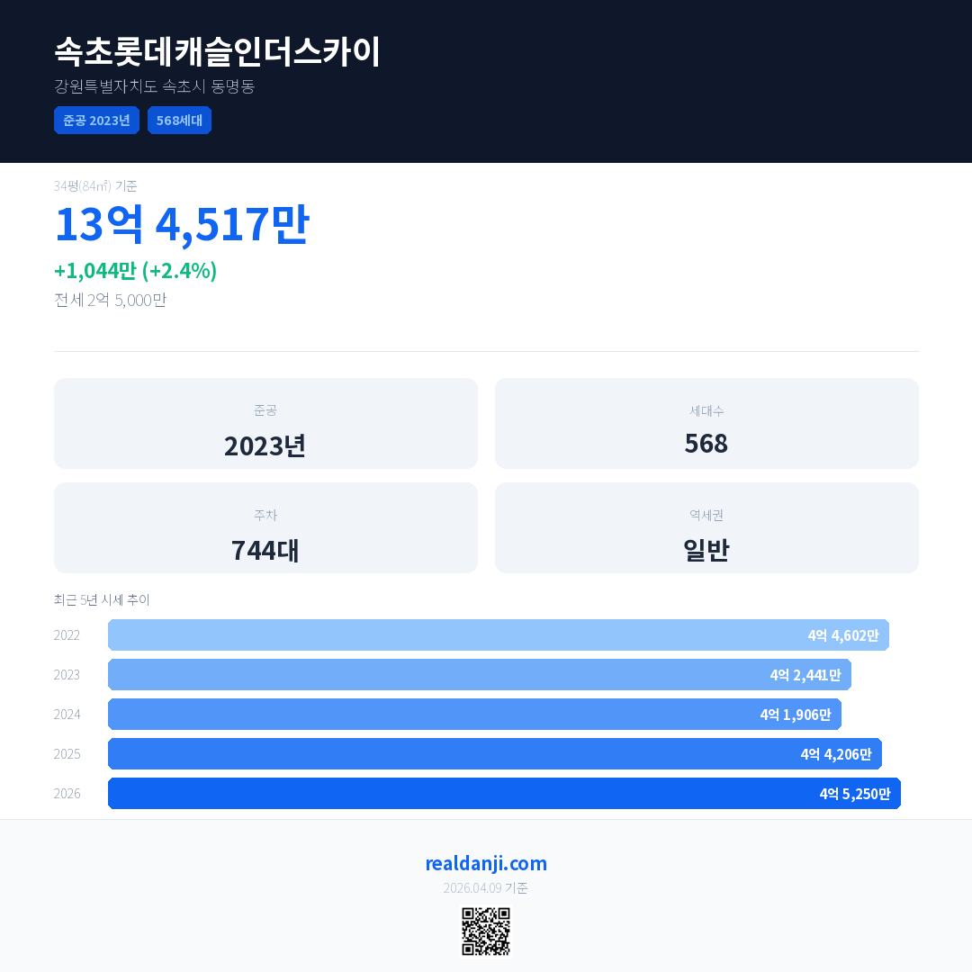 속초롯데캐슬인더스카이 최근 거래가는 4억 6,000만입니다. (2026-03)