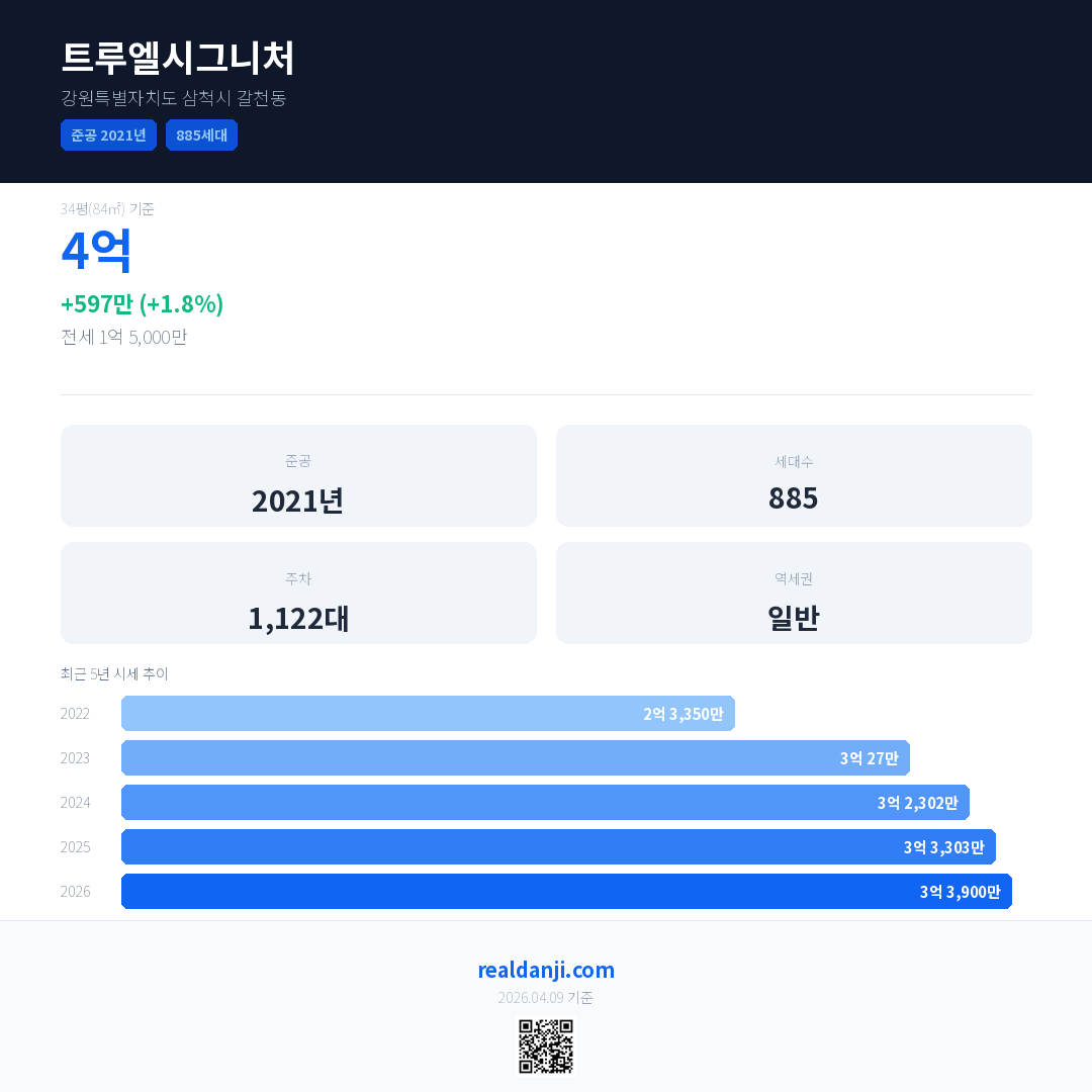 트루엘시그니처 국민평형 기준 2026년 평균 거래가는 3억 3,900만으로, 전년 대비 1.8% 상승 했습니다.