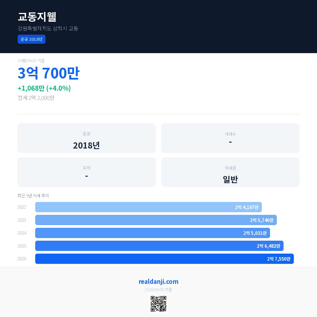 교동지웰 국민평형 기준 2026년 평균 거래가는 2억 7,550만으로, 전년 대비 4.0% 상승 했습니다.