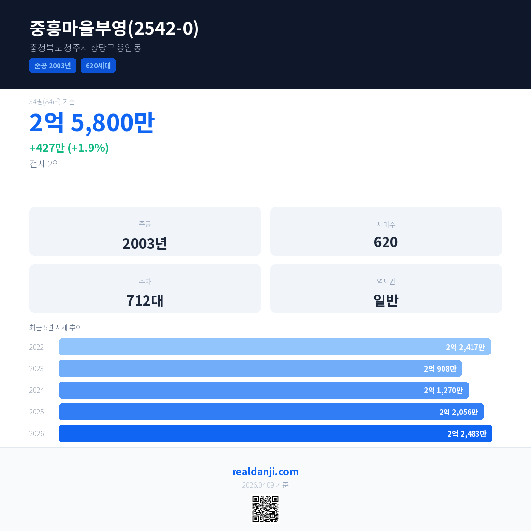 중흥마을부영(2542-0) 국민평형 기준 2026년 평균 거래가는 2억 2,483만으로, 전년 대비 1.9% 상승 했습니다.
