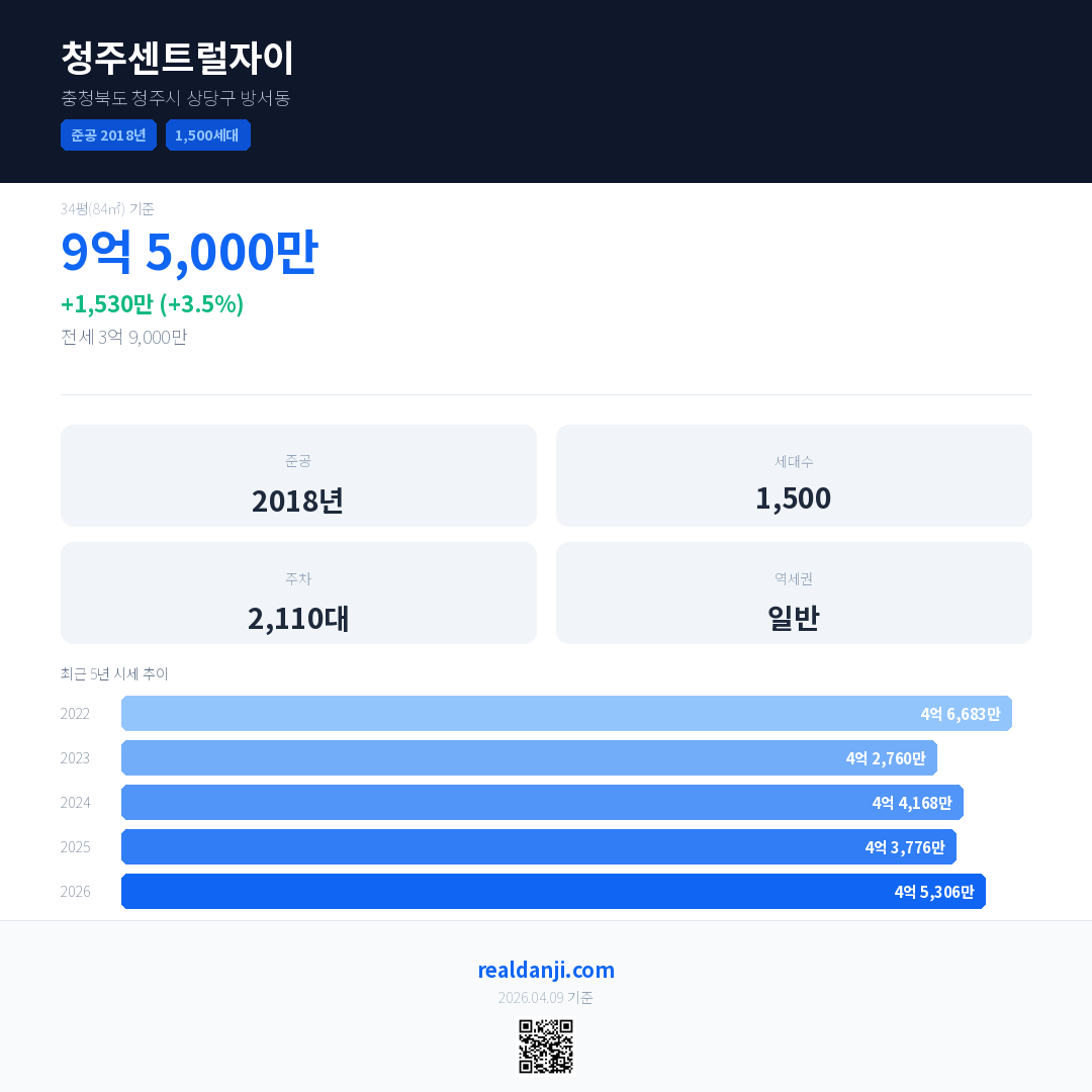 청주센트럴자이 국민평형 기준 2026년 평균 거래가는 4억 5,306만으로, 전년 대비 3.5% 상승 했습니다.