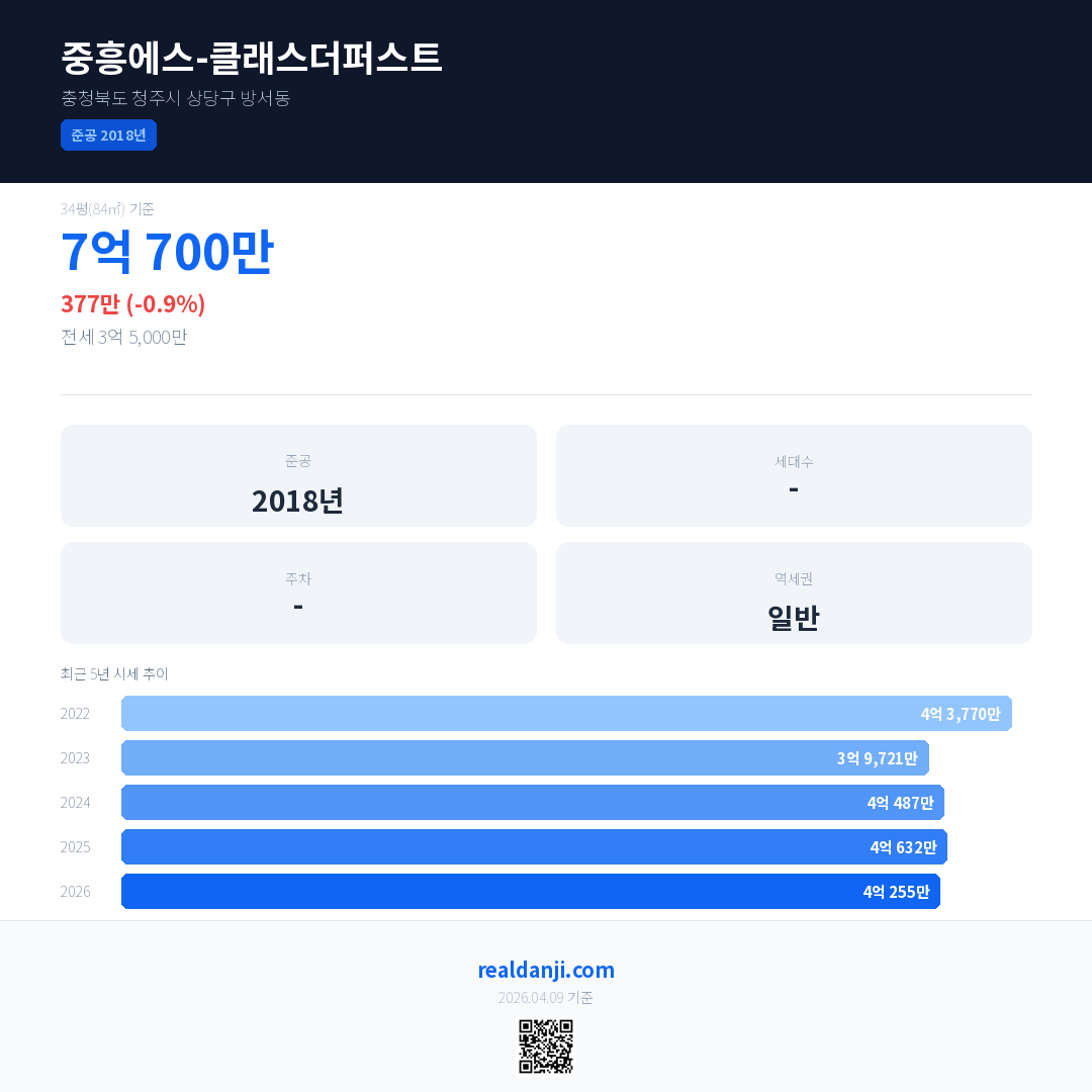 중흥에스-클래스더퍼스트 국민평형 기준 2026년 평균 거래가는 4억 255만으로, 전년 대비 0.9% 하락 했습니다.