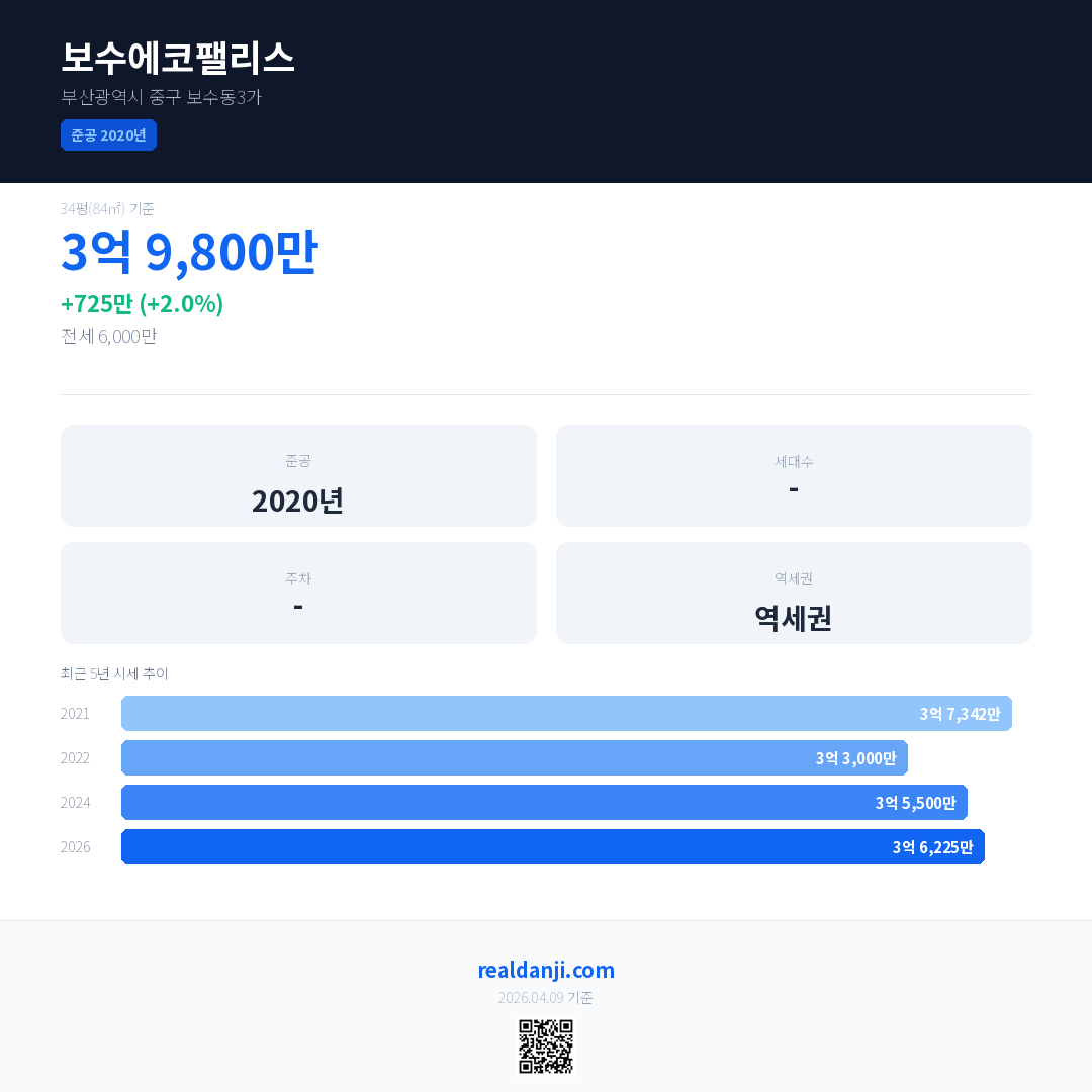 보수에코팰리스은(는) 2020년에 준공되었으며, 현재 6년차입니다.