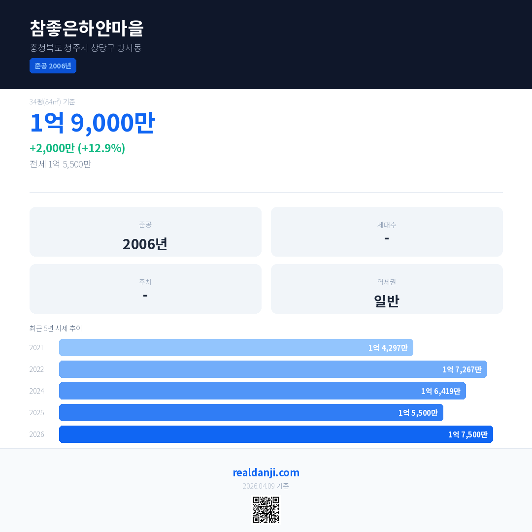 참좋은하얀마을 국민평형 기준 2026년 평균 거래가는 1억 7,500만으로, 전년 대비 12.9% 상승 했습니다.
