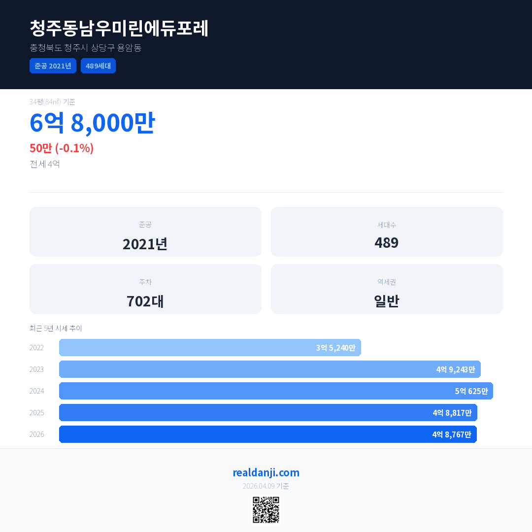 청주동남우미린에듀포레 최근 거래가는 4억 8,900만입니다. (2026-03)