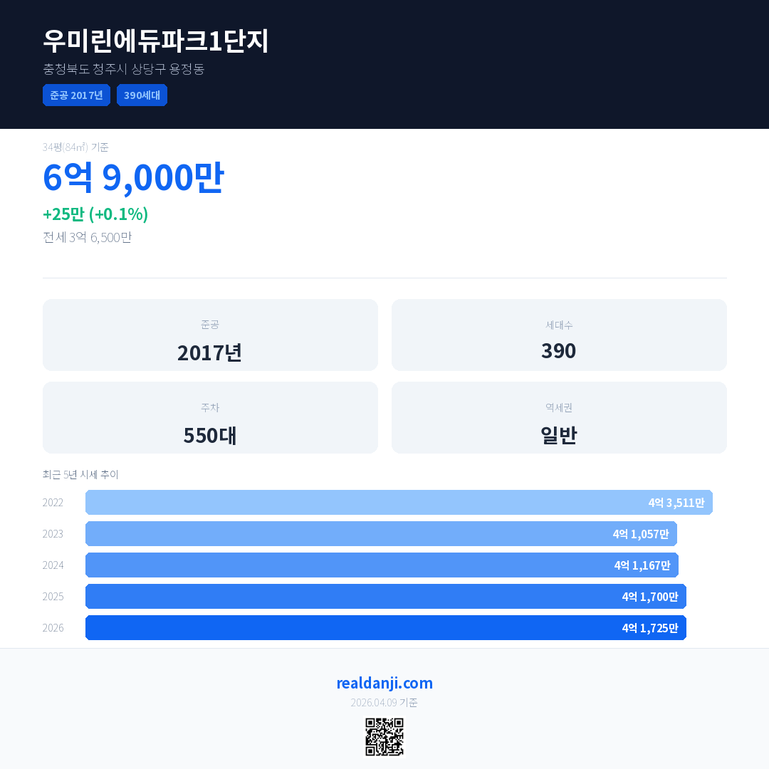 우미린에듀파크1단지 국민평형 기준 2026년 평균 거래가는 4억 1,725만으로, 전년 대비 0.1% 상승 했습니다.