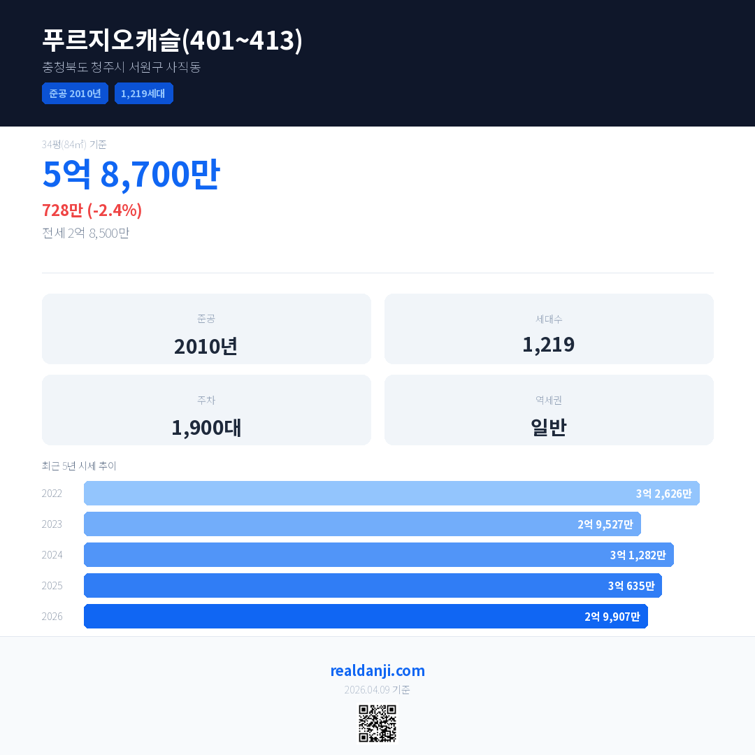 푸르지오캐슬(401~413) 최근 거래가는 5억 8,700만입니다. (2026-04)