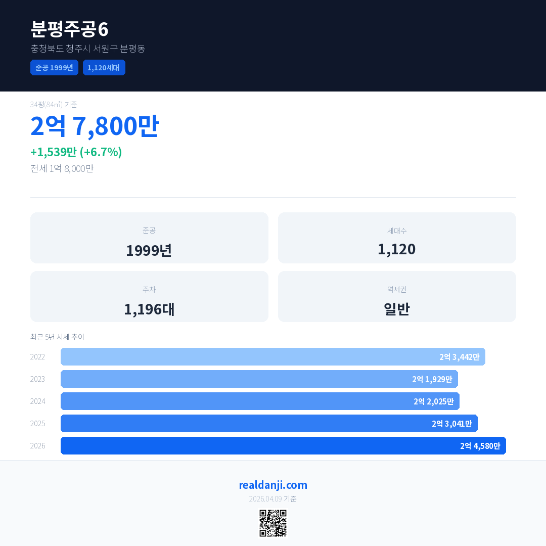 분평주공6 국민평형 기준 2026년 평균 거래가는 2억 4,580만으로, 전년 대비 6.7% 상승 했습니다.