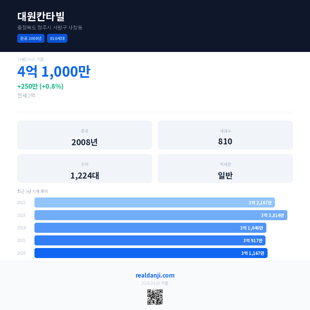 대원칸타빌 국민평형 기준 2026년 평균 거래가는 3억 1,167만으로, 전년 대비 0.8% 상승 했습니다.