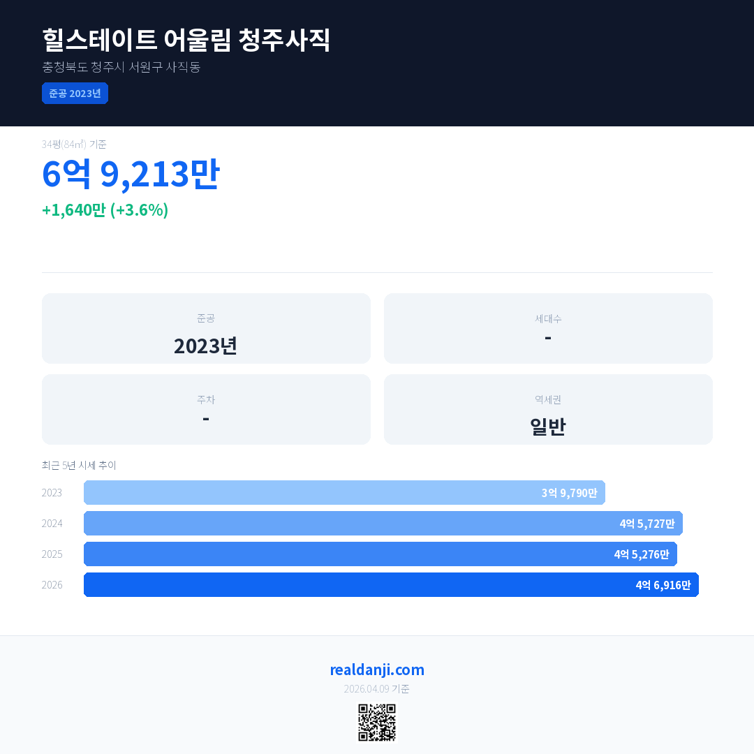 힐스테이트 어울림 청주사직 국민평형 기준 2026년 평균 거래가는 4억 6,916만으로, 전년 대비 3.6% 상승 했습니다.