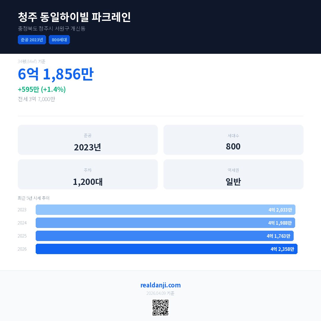 청주 동일하이빌 파크레인 국민평형 기준 2026년 평균 거래가는 4억 2,358만으로, 전년 대비 1.4% 상승 했습니다.