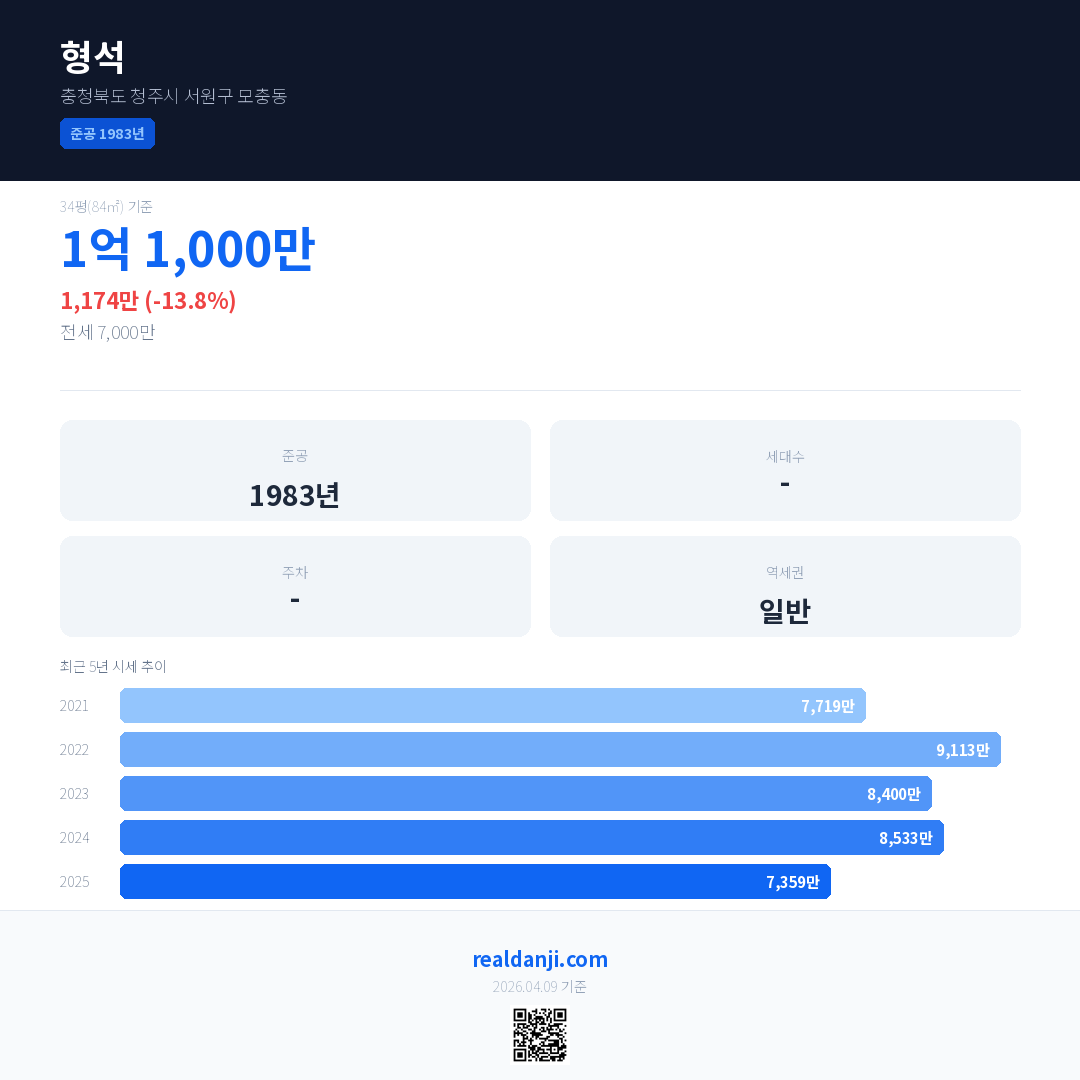형석 국민평형 기준 2025년 평균 거래가는 7,359만으로, 전년 대비 13.8% 하락 했습니다.