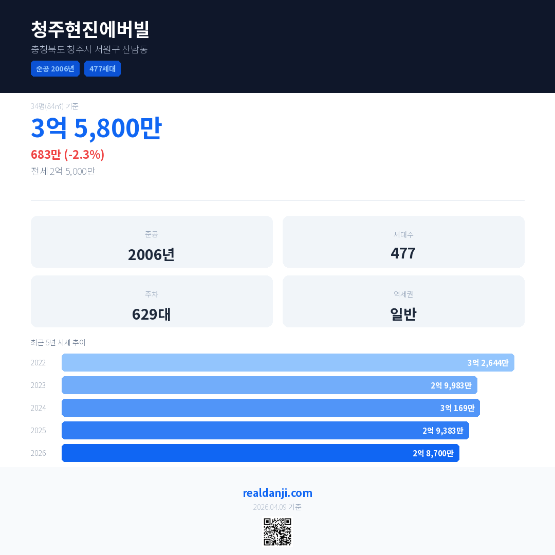 청주현진에버빌은(는) 2006년에 준공되었으며, 현재 20년차입니다. 총 477세대 규모입니다.