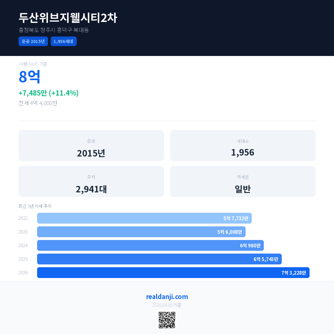 두산위브지웰시티2차 국민평형 기준 2026년 평균 거래가는 7억 3,228만으로, 전년 대비 11.4% 상승 했습니다.