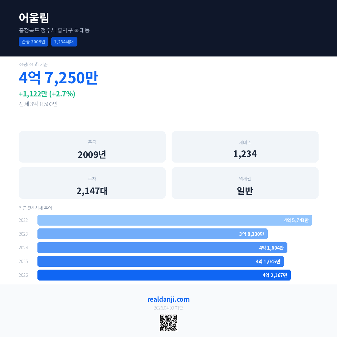 어울림 국민평형 기준 2026년 평균 거래가는 4억 2,167만으로, 전년 대비 2.7% 상승 했습니다.