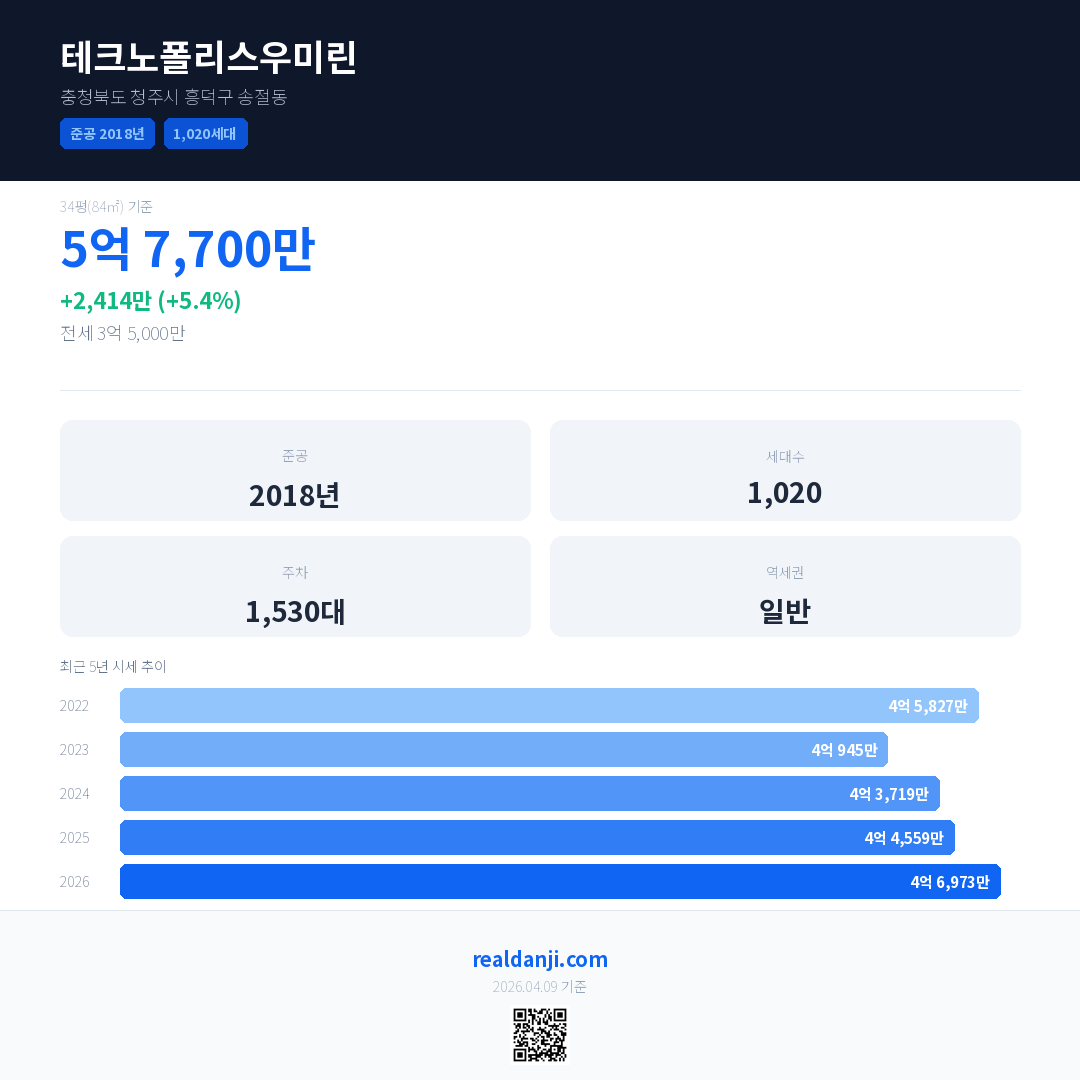 테크노폴리스우미린 국민평형 기준 2026년 평균 거래가는 4억 6,973만으로, 전년 대비 5.4% 상승 했습니다.