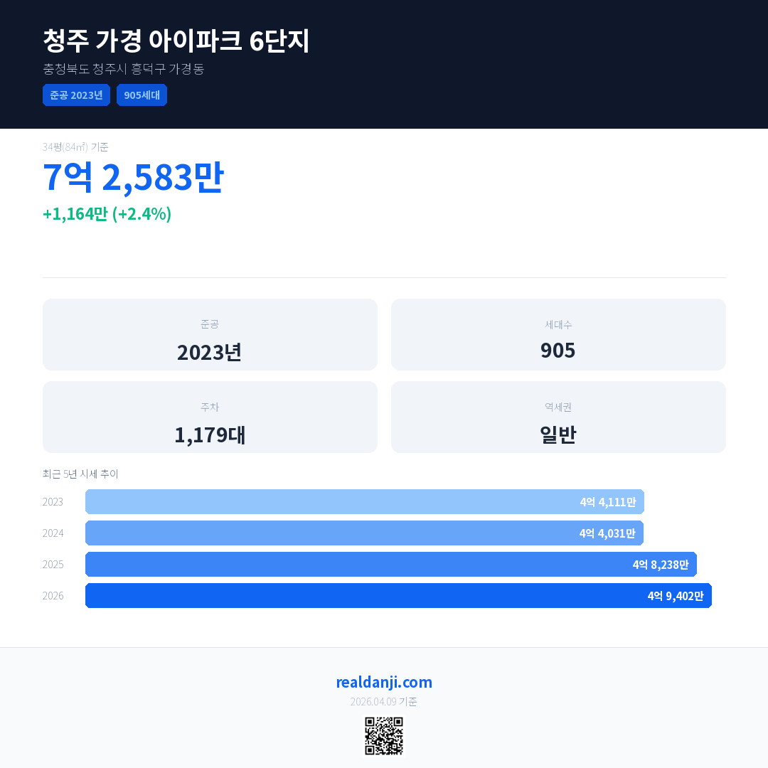 청주 가경 아이파크 6단지 국민평형 기준 2026년 평균 거래가는 4억 9,402만으로, 전년 대비 2.4% 상승 했습니다.