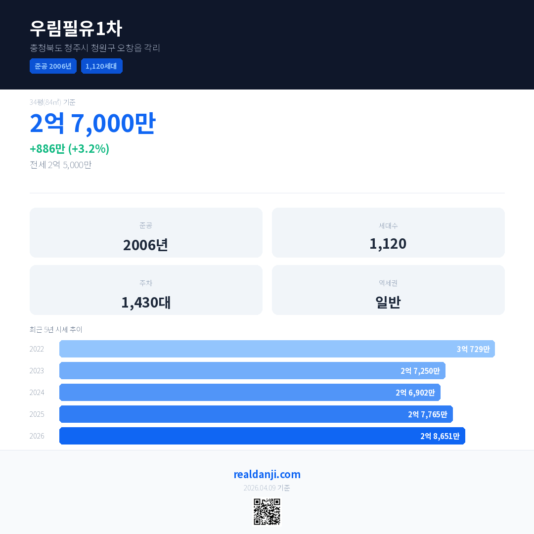 우림필유1차 국민평형 기준 2026년 평균 거래가는 2억 8,651만으로, 전년 대비 3.2% 상승 했습니다.