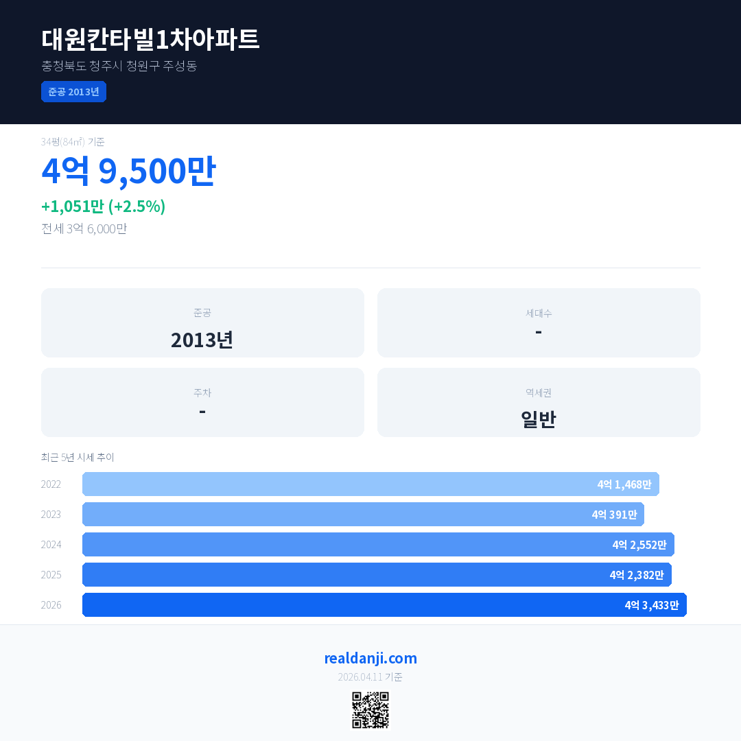 대원칸타빌1차아파트 국민평형 기준 2026년 평균 거래가는 4억 3,433만으로, 전년 대비 2.5% 상승 했습니다.