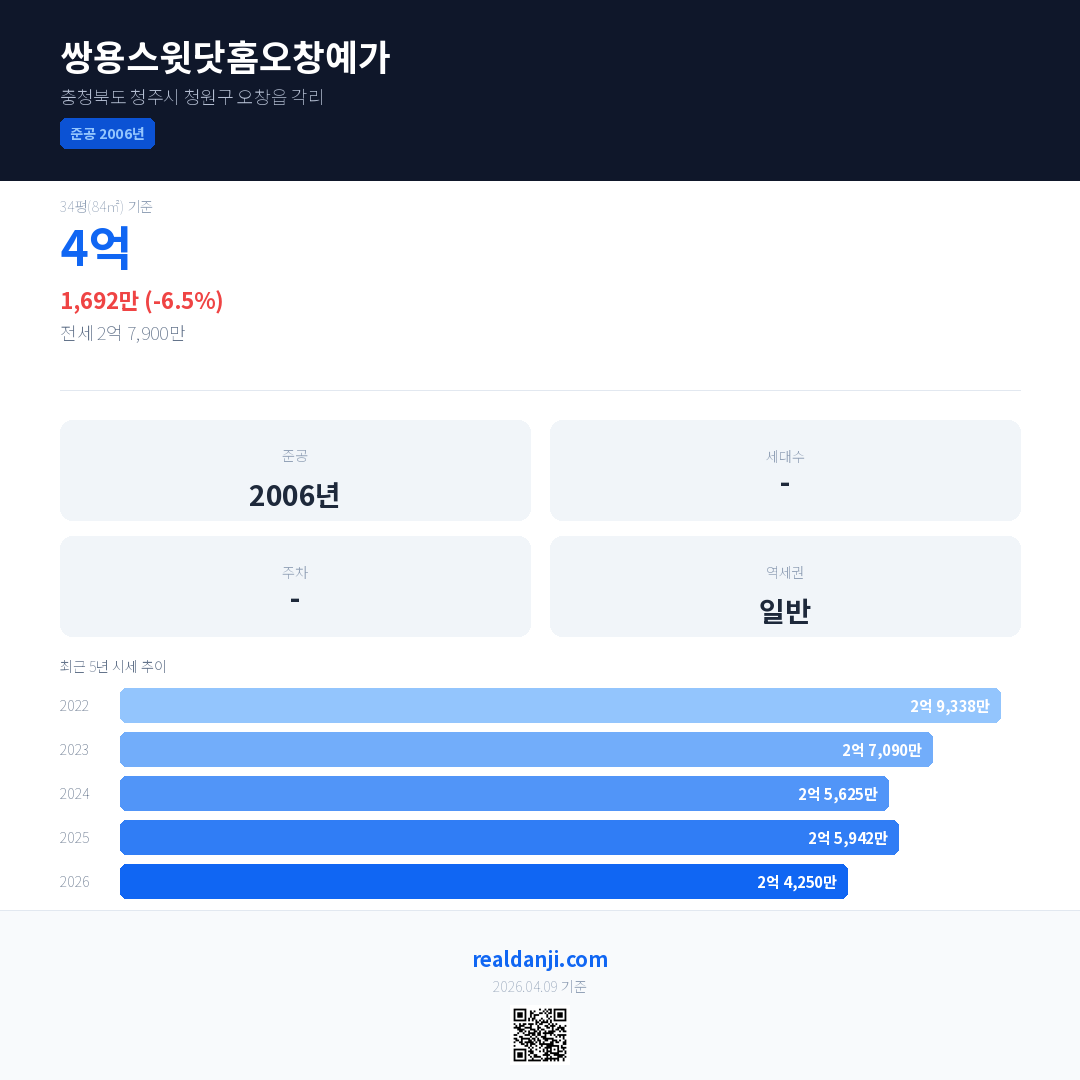 쌍용스윗닷홈오창예가 최근 거래가는 4억입니다. (2026-04)