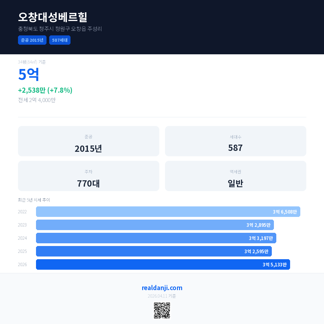 오창대성베르힐 최근 거래가는 5억입니다. (2026-03)