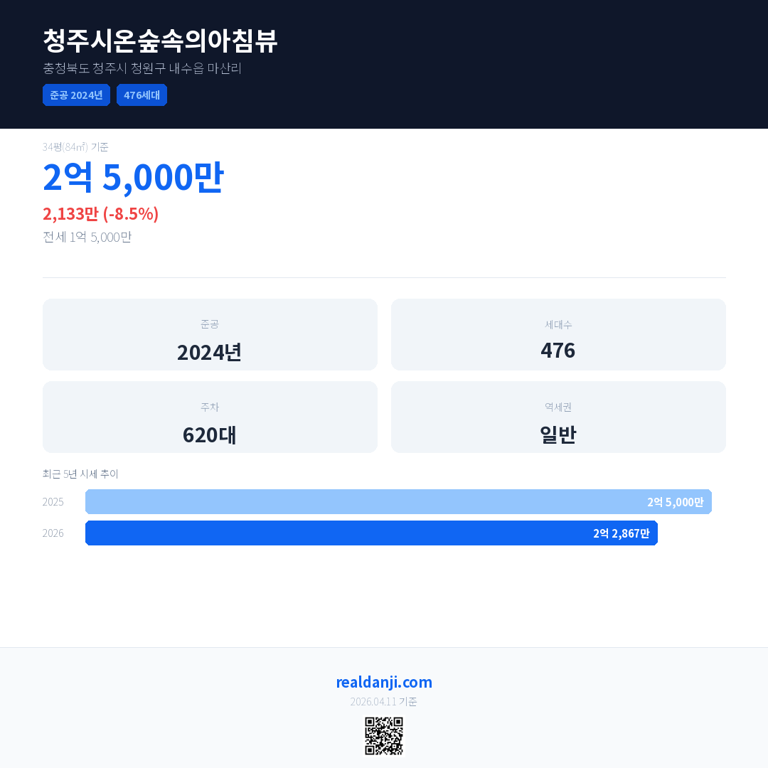 청주시온숲속의아침뷰 국민평형 기준 2026년 평균 거래가는 2억 2,867만으로, 전년 대비 8.5% 하락 했습니다.