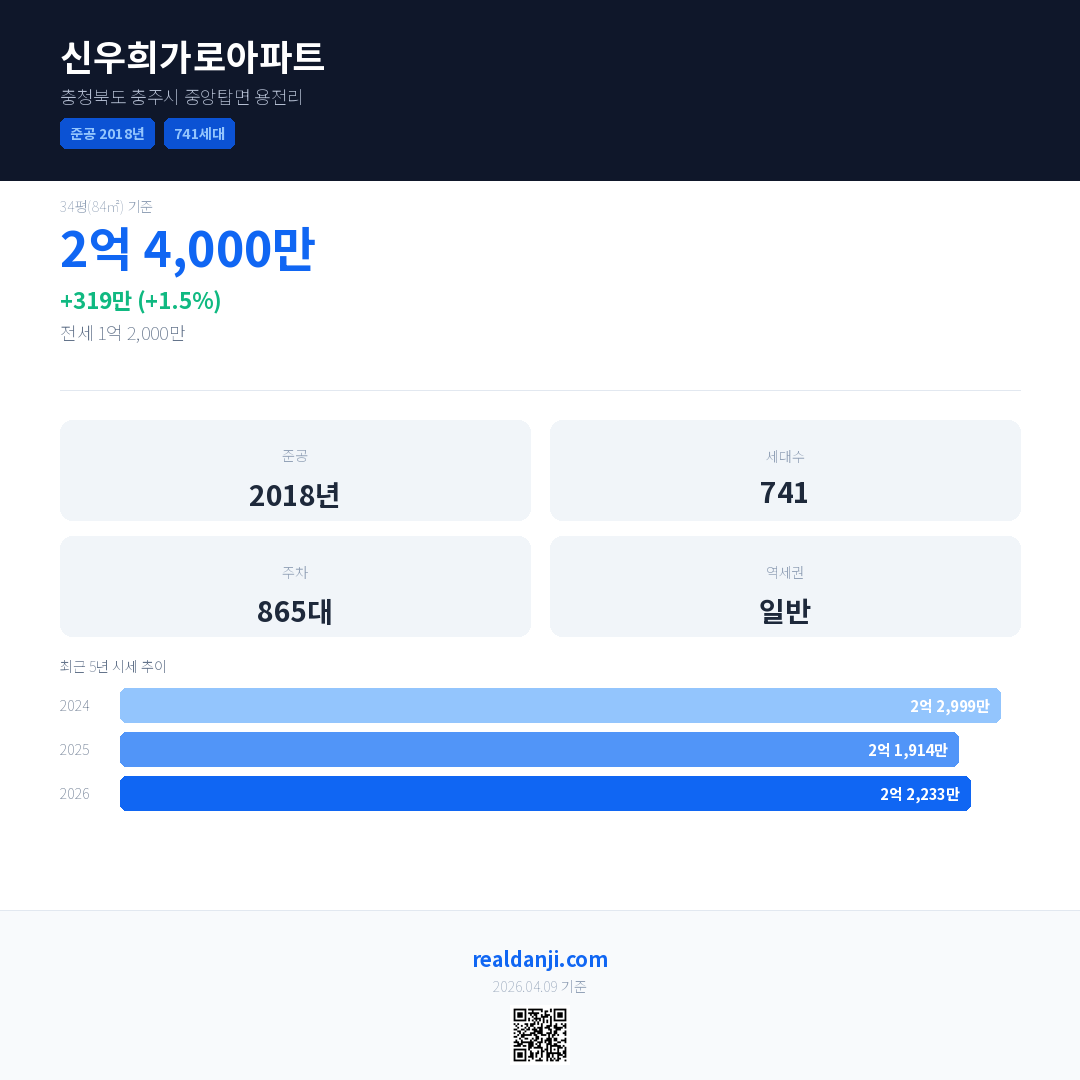 신우희가로아파트 국민평형 기준 2026년 평균 거래가는 2억 2,233만으로, 전년 대비 1.5% 상승 했습니다.