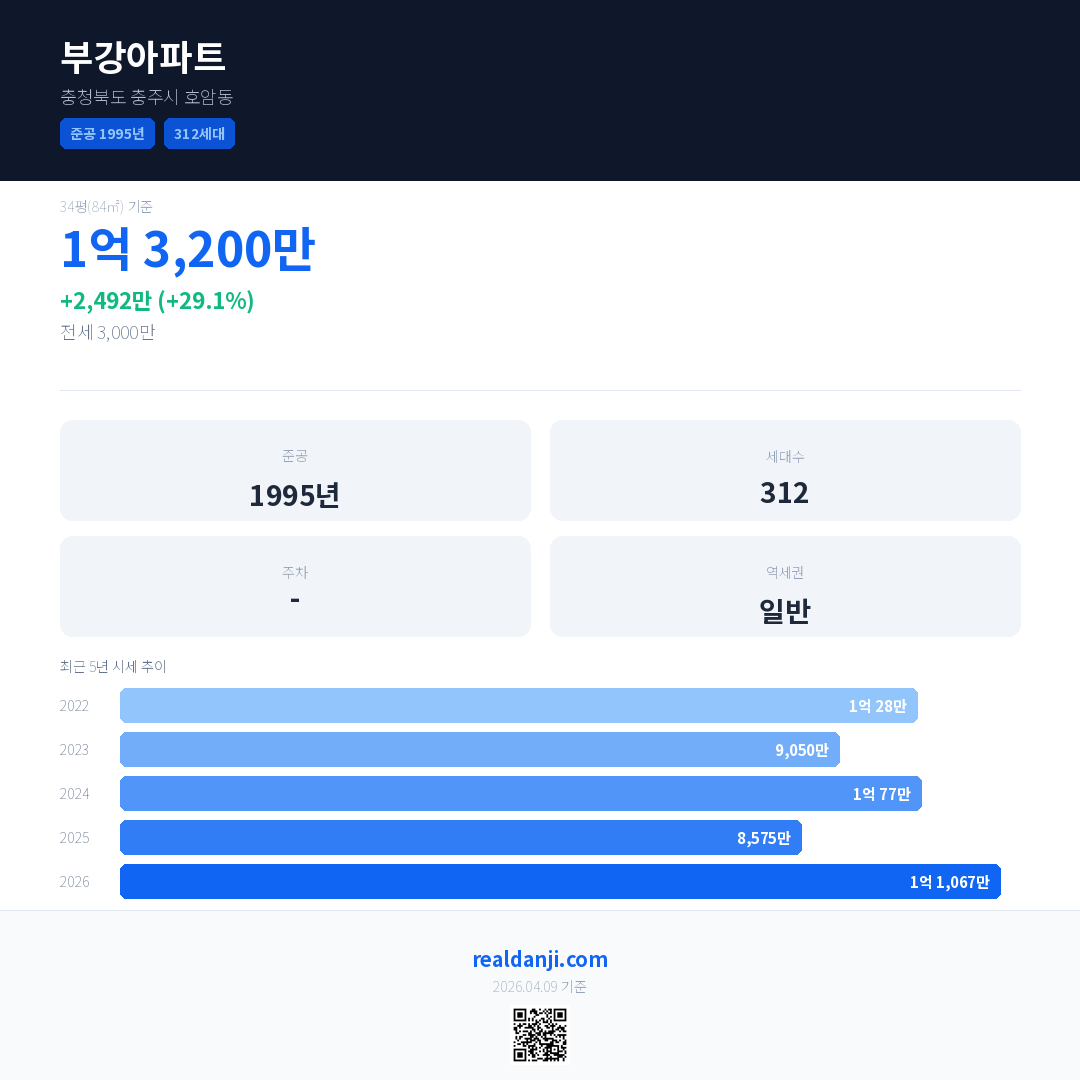 부강아파트 국민평형 기준 2026년 평균 거래가는 1억 1,067만으로, 전년 대비 29.1% 상승 했습니다.