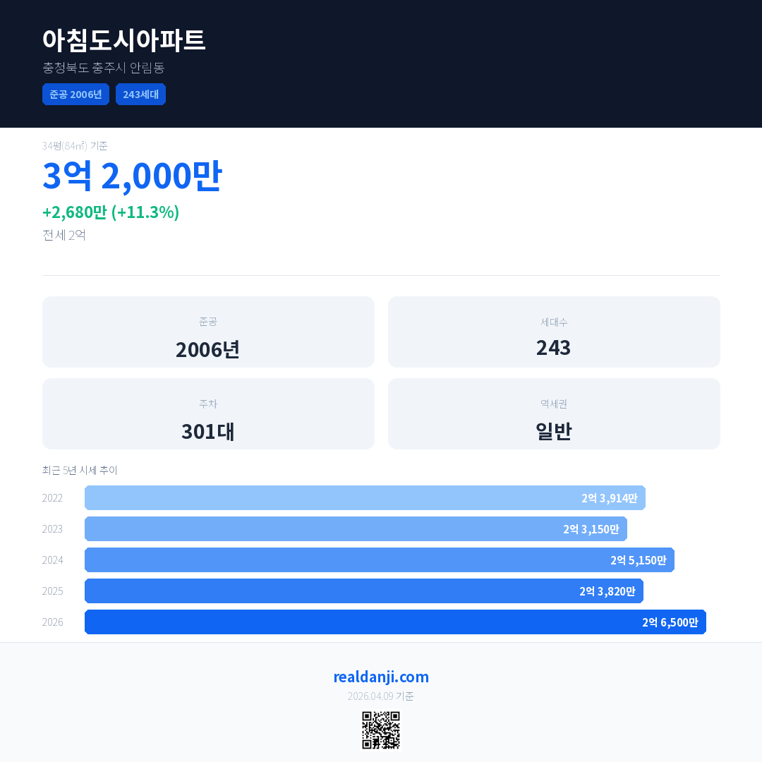 아침도시아파트 국민평형 기준 2026년 평균 거래가는 2억 6,500만으로, 전년 대비 11.3% 상승 했습니다.
