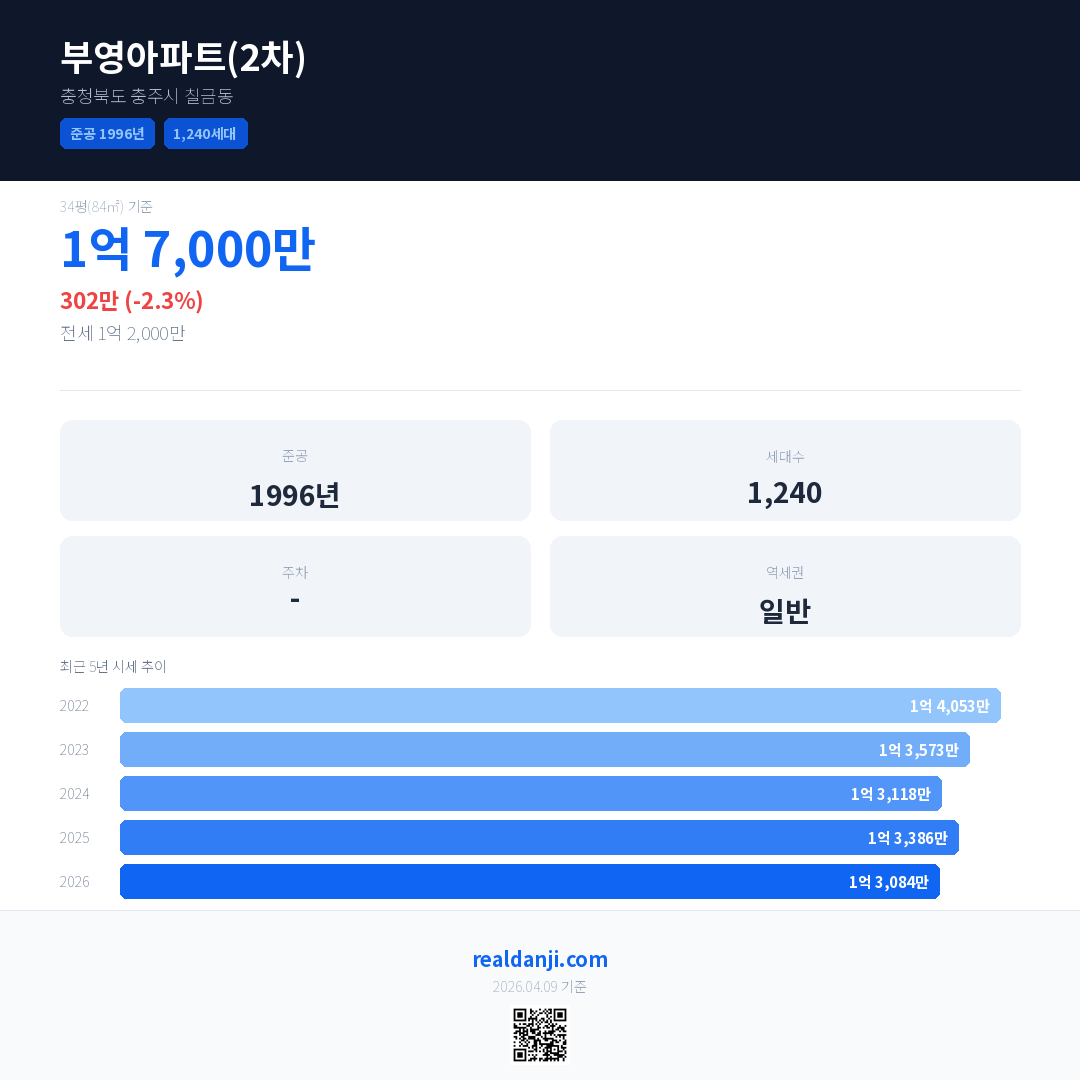 부영아파트(2차) 국민평형 기준 2026년 평균 거래가는 1억 3,084만으로, 전년 대비 2.3% 하락 했습니다.
